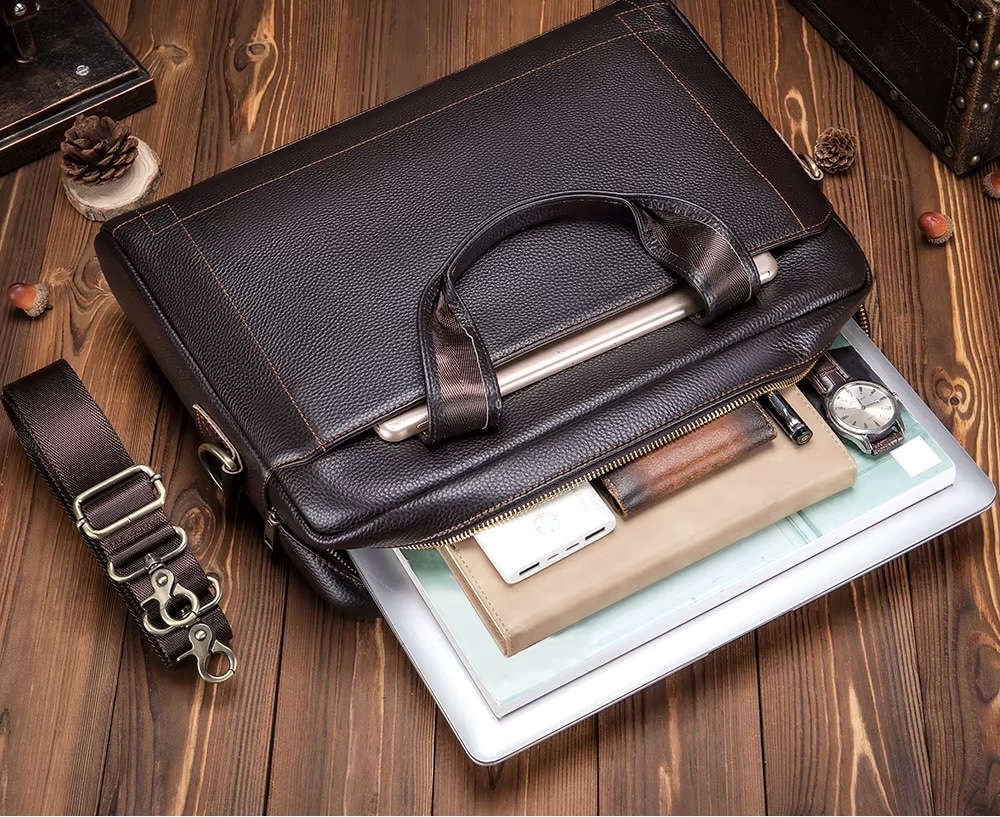 O design desta bolsa de couro masculina é uma verdadeira obra-prima. Com linhas elegantes e detalhes cuidadosamente pensados, ela combina perfeitamente com o estilo de homens que apreciam acessórios de alta qualidade. O couro de camada superior utilizado na confecção garante durabilidade e resistência, mantendo a pasta sempre com aparência de nova, mesmo após anos de uso contínuo. Seja para transportar documentos, eletrônicos ou objetos pessoais, essa bolsa atende a todas as necessidades do dia a dia com muito estilo.